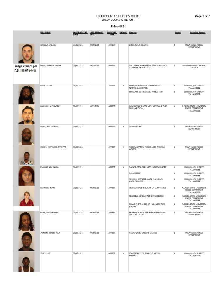 . Tallahassee booking report august 2021. August 24 2012 tallahassee leon county booking report for august 23 2012 attached is a pdf file containing all bookings at the leon county jail from august 23. Attached is a PDF file containing all bookings at the Leon County Detention Facility from Oct.